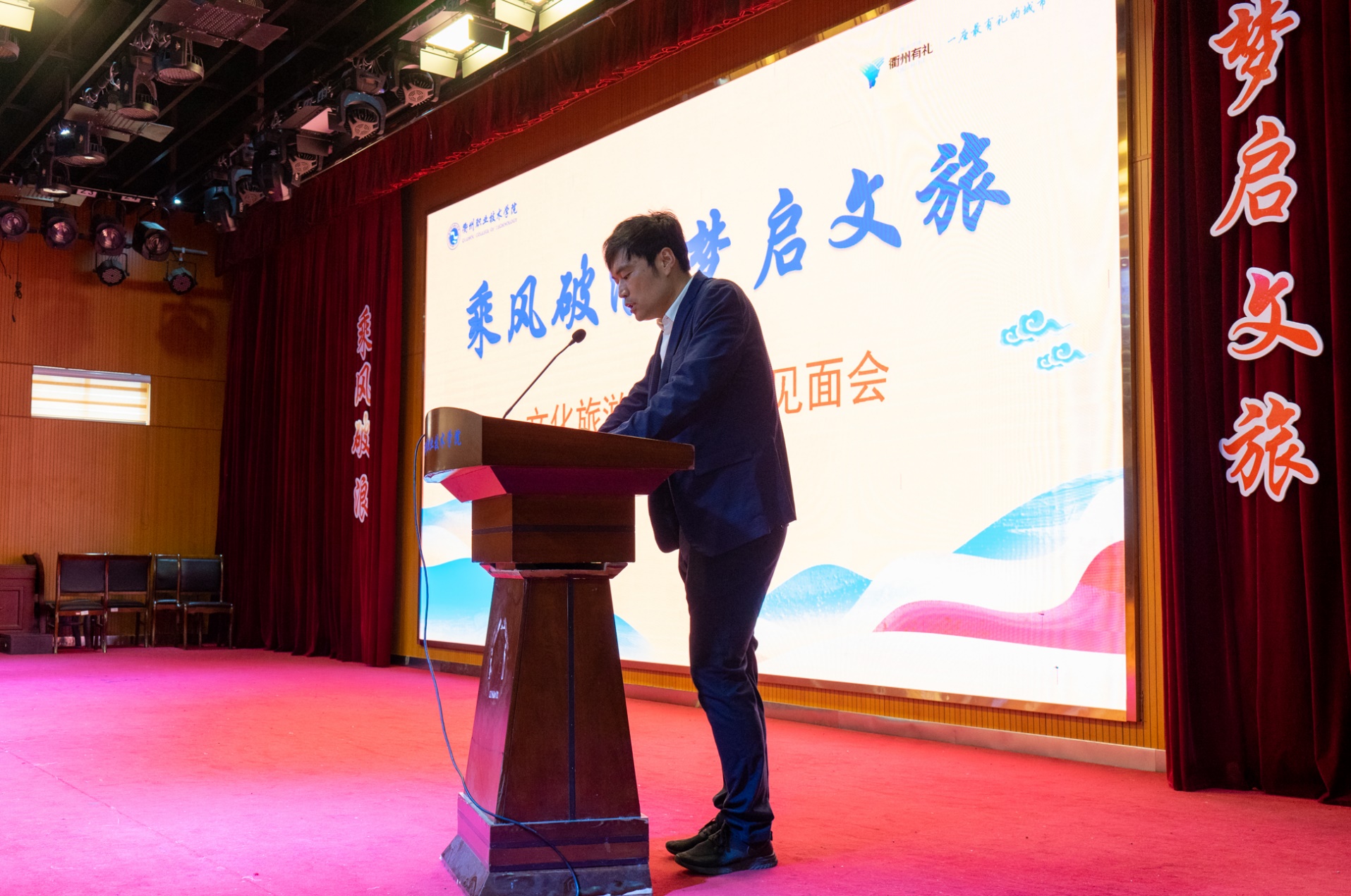 首先,文化旅游公司党总支书记(经理)郭大勇为全体新同学做了主题为“守正、创新,争做合格文旅人”的讲话。分别从专业设置、团队队伍、实训基地等方面向新生介绍了公司的整体办学情况,希望大家以此次新生见面会为老员工生活的新起点,重树人生目标。同时对新生们提了三点建议:一是要用理想信念指引方向。在未来奋斗的道路上,与民族同命运、与祖国共奋进,坚定信念、勇挑重担、奋发有为;二是要用扎实学识积蓄力量。在大学的三年中要把专业知识学活学透、把专业技能练熟练精、把身体素质变强变好。三是要用坚毅品格披荆斩棘。在今后的人生道路中能满怀一颗赤子之心,哪怕在努力追求成功的道路上遭到质疑或非议也能保持热情,从头再起。最后希望同学们在大学的三年时光中,争做一名合格的文旅人,为美好的明天而努力成长。