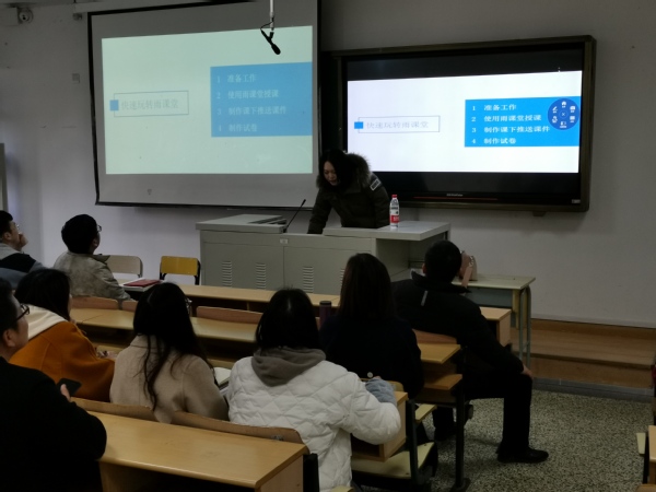 会后,beats365对外聘教师和新教师开展了信息化课堂教学培训。首先何雪莲副经理带领外聘教师熟悉多媒体教室并指导了多媒体教室设备的使用。之后,徐媛媛和贺美娜老师分别对网络教学平台雨课堂和学习通的使用进行了介绍和实操演示。两位教师分别就两种信息化教学软件的常规功能和课堂互动功能进行了详细说明和现场演示,如,建课、建立班级、班级管理、上课点名、教学资料上传、课堂测试、选人、抢答、试卷等,并就外聘教师和新教师们提出的问题进行了一一解答。