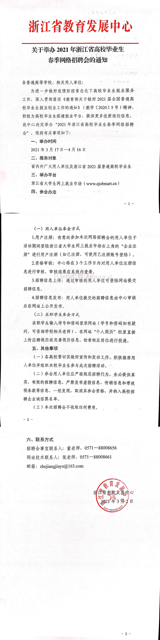 关于举办2021年浙江省高校毕业生春季网络招聘会的通知