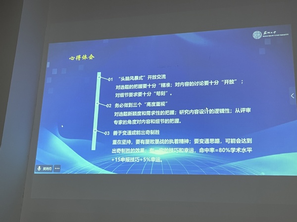 会上,樊炳有教授就选题方向、内容论证、研究总结等方面对体育科研项目申报要素进行详细解读,结合自身科研项目申报经历,从“头脑风暴式”开放交流、务必做到三个“高度重视”、善于变通或能出奇制胜等角度交流心得体会。
