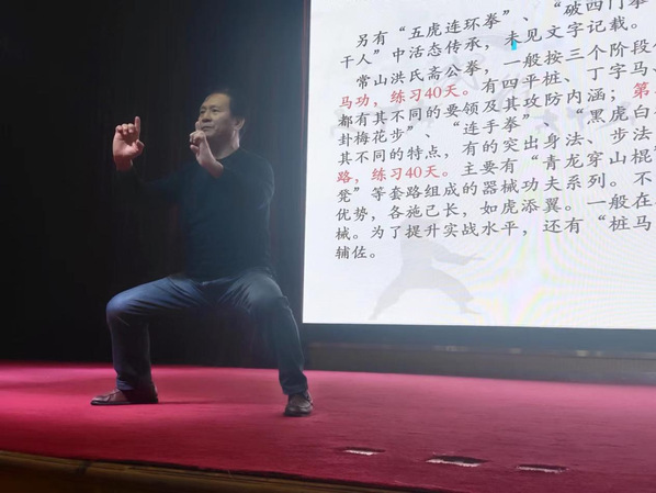 洪文达老师为同学们介绍了常山洪氏斋公拳的溯源、流传的主要套路及拳法特征,以及洪氏斋公拳的传承价值与弘扬意义。常山洪氏斋公拳起源于清光绪年间,由彤弓乡关庄桥村新庙洪姓斋公传授的一种实战武术。该拳具南拳之刚猛,洪拳之风格,其套路演练以“吞、吐、沉、浮”来调养身心,重在桩马基础练习。实战时要求根基沉稳、攻守严紧、出手快捷、发力刚猛,实用性和观赏性兼备。