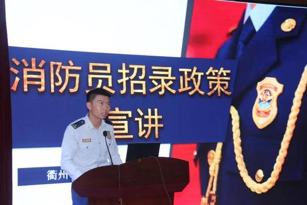平嘉乐进行了2023年度消防员招录政策宣讲。他为同学们介绍了消防员的工作和生活情况、衢州消防救援队伍的发展历程和招录政策,鼓励广大有志青年加入到这支队伍磨练意志、增长才干、放飞青春、追逐梦想,为维护衢州一方平安贡献自己的青春和力量。