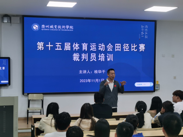 11月1日,公共体育部组织召开了裁判员培训会。培训会由田径国家级裁判、具有丰富的国际、国家级和省级田径裁判工作经验的桂华干老师担任主讲,全体师生裁判员参加培训。