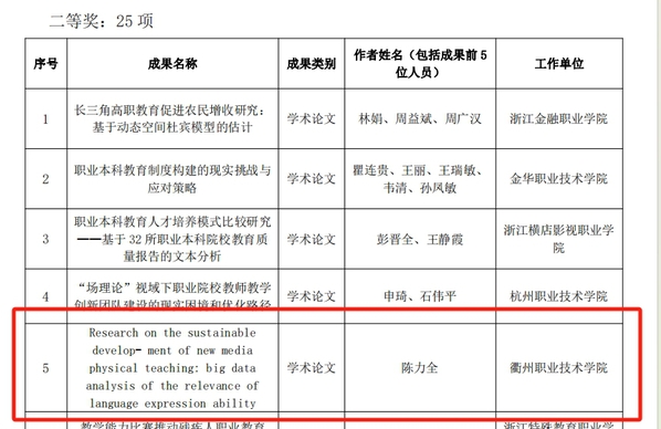 近日,浙江省成人教育与职业教育协会发布了《2024 年浙江省职业教育与成人教育优秀教科研成果评选结果公示》文件,公司陈力全博士的学术论文Research on the sustainable development of new media physical teaching: big data analysis of the relevance of language expression ability 获得高职高教类二等奖。