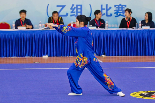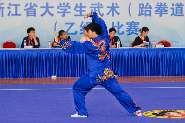 武术队队员们自信的演绎着武术套路,面对强手毫不畏惧,突破自我,凭借出色的表现和良好的心理素质,稳定发挥,队员余万青获男子太极拳第五名;黄体棵获男子42太极剑第六名、男子太极拳第七名。